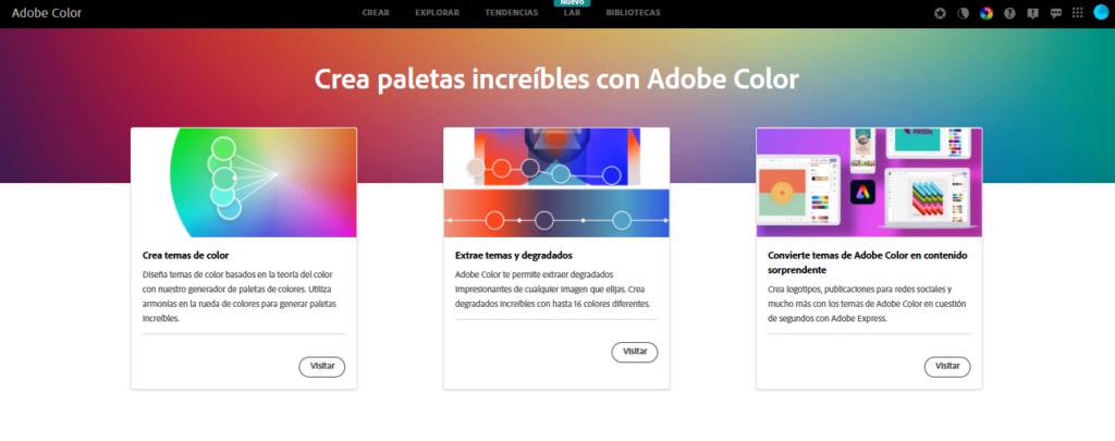 - Barra de navegación superior: Contiene las secciones de Explorar y Tendencias donde podemos ver qué combinaciones de colores están usando otros profesionales en industrias como la moda o el diseño gráfico,