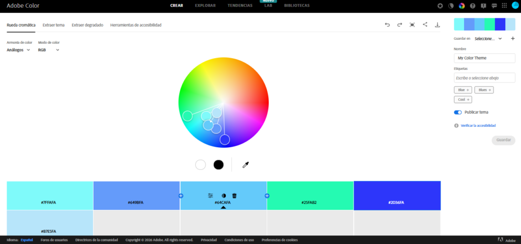 - Generador de temas de color: Es el acceso directo a la rueda cromática interactiva donde podemos aplicar reglas de armonía como colores complementarios o tríadas,
