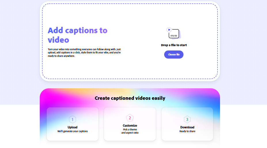- Subir el archivo: La interfaz presenta un área clara donde puedes arrastrar tu video o usar el botón de “Choose file” para buscarlo en tu computadora.
